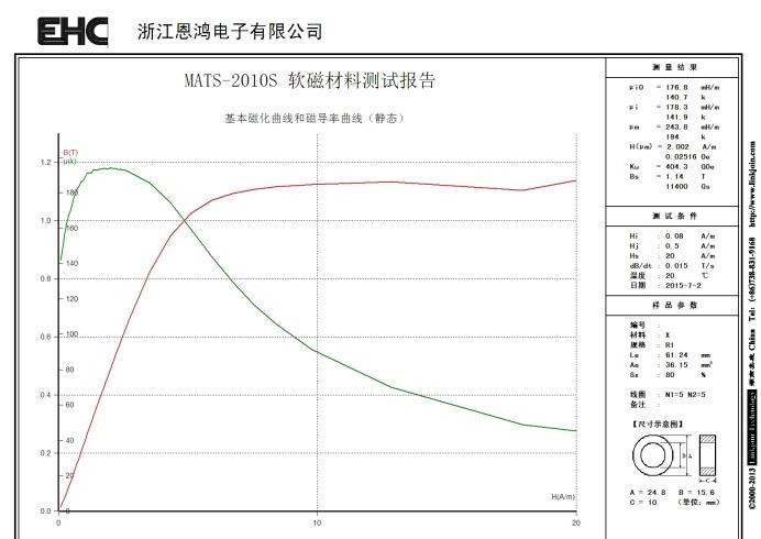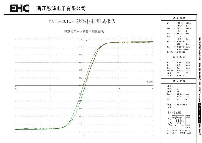 | Permeabilitate maximă μm | Magnetizare de saturație Bs (T) | Coercitivitatea Hc (A.m) | Remanent Br (T) | Pierdere (20k, 0,5 T) Ps cu kg |