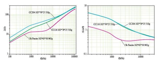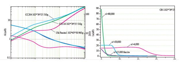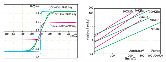 | Comparație între inductanța și impedanța unei singure ture a miezului nanocristalin și de ferită | Comparație între bucla de histerezis statică și pierderea miezului între miezurile nanocristaline și de ferită |